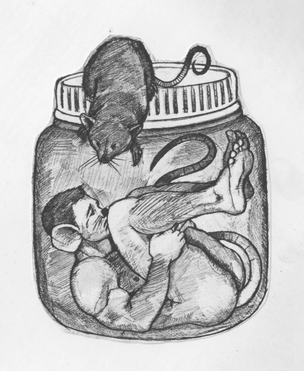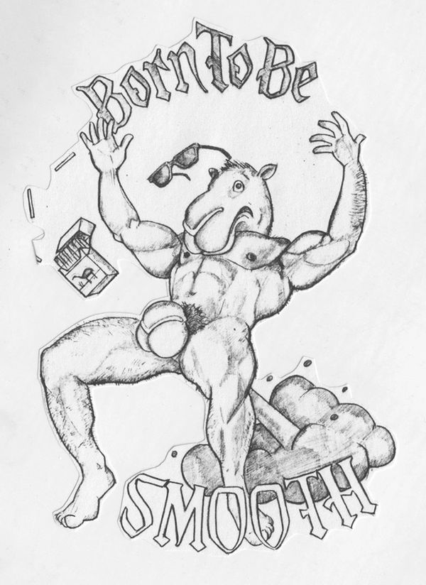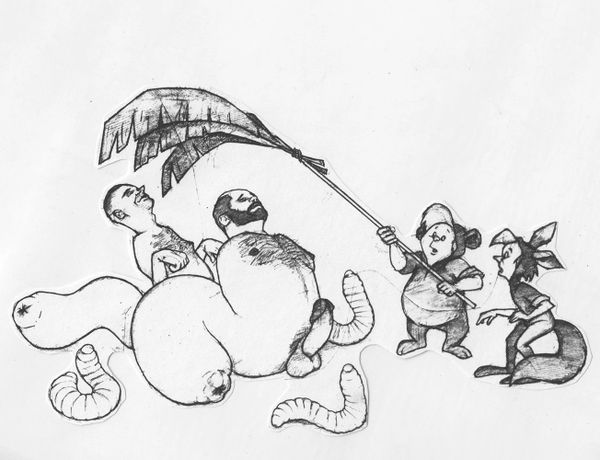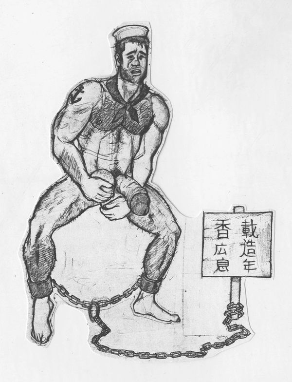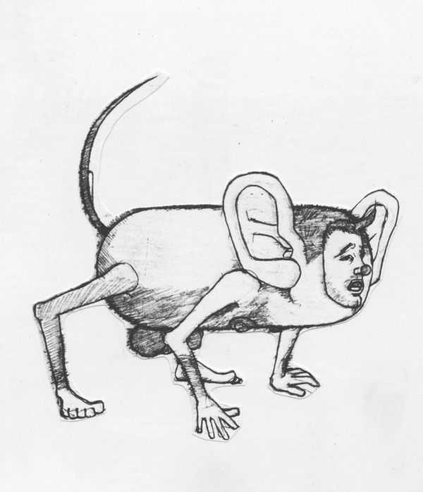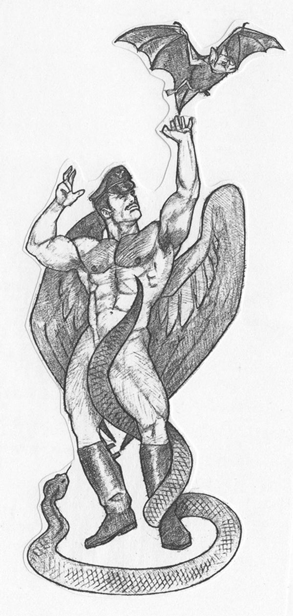 It’s made of hundreds of cut outs of Xeroxed images from my sketch book pinned to the wall like butterflies. They are the descendants of the erotic doodles I started making in ‘86. The large amount of images was meant to make something substantial out of something small and ephemeral. I drew these images from varying combinations of reference material and imagination.